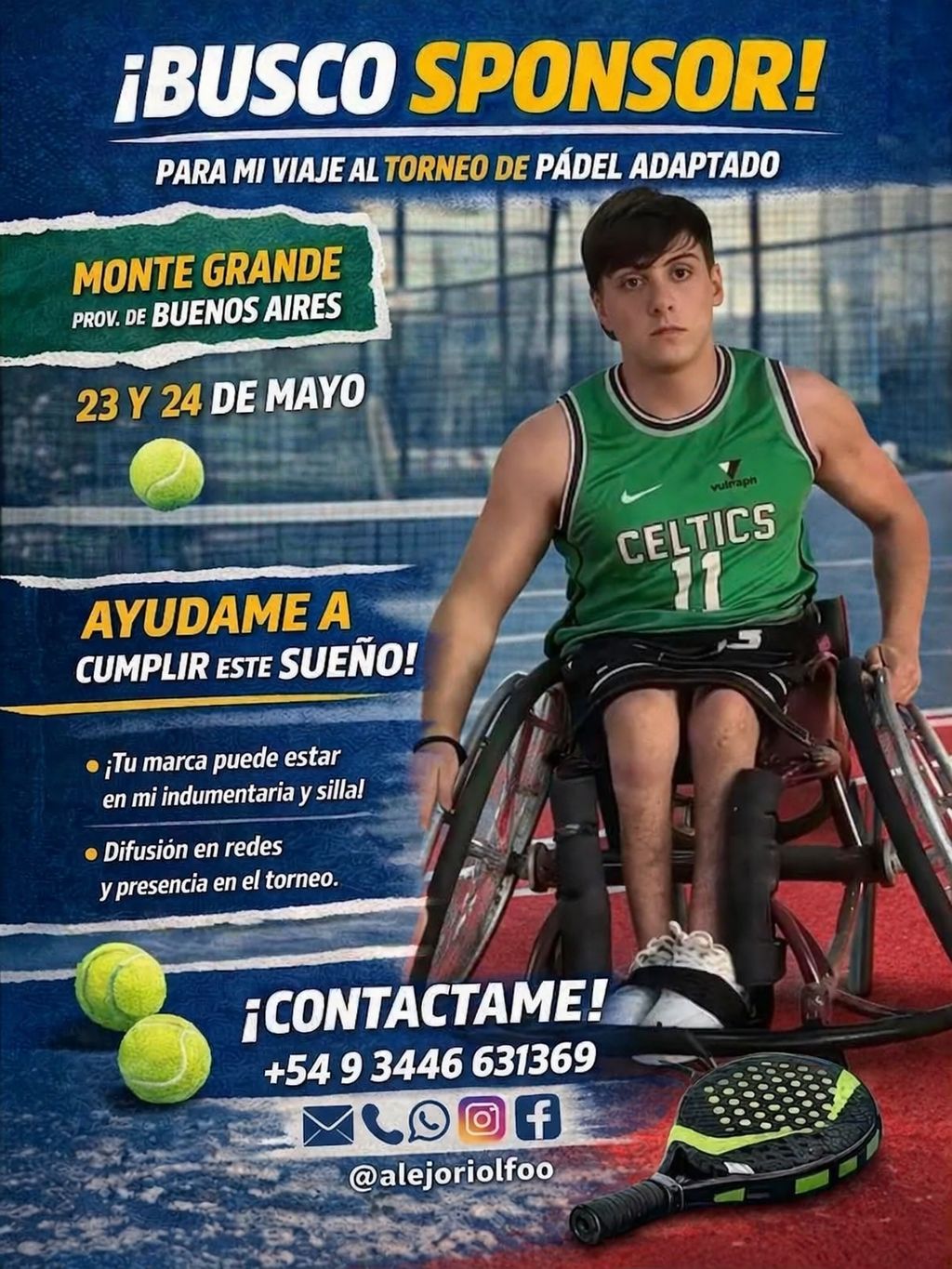 Hoy, mientras se abre paso en el pádel adaptado, Alejo también está en la búsqueda de sponsors y apoyo económico que le permitan sostener su participación en torneos y seguir creciendo en el deporte.