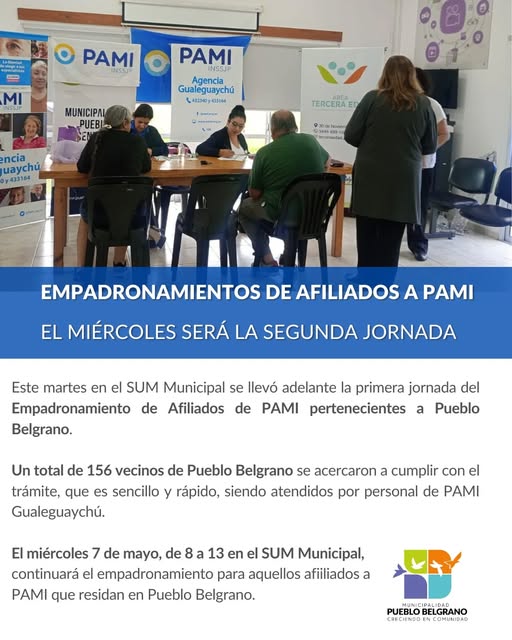 El miércoles 7 de mayo, de 8 a 13 en el SUM Municipal, continuará el empadronamiento para aquellos afiiliados a PAMI que residan en Pueblo Belgrano.